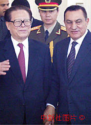 中國國家主席江澤民4月17日抵達埃及的亞歷山大,與埃及總統穆巴拉克會晤。中新社記者 彭偉祥 攝