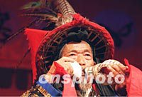 云南省麗江地區人稱“國寶老人”的和國華,今年七十四歲依然體魄如壯年人,如今同時吹響兩支法螺樂號,音色悠揚。中新社圖 吳新華 攝