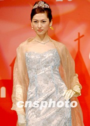 港姐李嘉慧2日在香港舉行的情人節婚紗及用品展上,演繹“麗都魅力新娘婚紗晚裝”盡顯美態。中新社傳真 洪少葵 攝