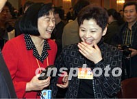 出席全國政協九屆五次會議閉幕會的董文華,在會場與工作人員交談,笑逐顏開。中新社圖 毛建軍 攝