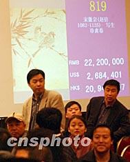 多圖:神秘青年天價(jià)買走宋徽宗《寫生珍禽圖》 2002年04月23日 22:36 ![]() 宋徽宗親筆畫《寫生珍禽圖》二十三日在北京拍賣會(huì)上以兩千三百萬元人民幣的天價(jià)創(chuàng)下中國古字畫的最高價(jià)格。圖為激烈的競拍場面。中新社圖 武仲林 攝 ![]() 一位不愿透露身份的神秘人物二十三日在北京中國嘉德春季拍賣會(huì)上以兩千三百萬元人民幣的天價(jià)競得《寫生珍禽圖》。這幅從海外征集歸來的稀世珍寶是世存十三件宋徽宗親筆畫之一。圖為神秘得主競買成功后掩面離開拍賣場。中新社圖 武仲林 攝 ![]() 亡國皇帝宋徽宗國寶畫卷《寫生珍禽圖》,日前驚現(xiàn)北京,參加四月嘉德國際春季拍賣。亡于千年前“靖康之恥”的宋徽宗趙佶,史稱治國無能的大藝術(shù)家皇帝,傳世僅十九件畫卷價(jià)值連城。圖為卷首有乾隆皇帝題寫的《杏苑春聲》。中新社記者 賈國榮 攝 ![]() 亡國皇帝宋徽宗國寶畫卷《寫生珍禽圖》,年初由海外神秘人士出手,日前驚現(xiàn)北京,參加四月嘉德國際春季拍賣。亡于千年前“靖康之恥”的宋徽宗趙佶,史稱治國無能的大藝術(shù)家皇帝,傳世僅十九件畫卷價(jià)值連城。中新社記者 賈國榮 攝 中新社北京四月二十三日電(記者于晶波)今天中午十二時(shí),從海外征集歸來的稀世珍品——宋徽宗親筆畫《寫生珍禽圖》在中國嘉德春拍會(huì)上被一位二十多歲神秘青年買走。這位青年開出的二千三百萬元(人民幣,下同)的競拍天價(jià)創(chuàng)造了中國書畫拍賣史的最高記錄。 今天上午十一時(shí)四十分左右,當(dāng)拍賣師宣布完《寫生珍禽圖》的起拍價(jià)為七百八十萬元后,立即有人舉拍應(yīng)價(jià)。十幾分鐘后,拍賣價(jià)格輕易突破一千萬元和兩千萬元大關(guān)。 記者在現(xiàn)場看到,當(dāng)《寫生珍禽圖》的價(jià)格升至一千五百萬的時(shí)候,競價(jià)方主要在幾位電話委托的買家之間進(jìn)行。這幾位電話委托買家迅速將該畫價(jià)格推至一千九百萬。正當(dāng)場外激烈競價(jià)不分高低時(shí),場內(nèi)的一匹黑馬(競拍號(hào)為九三六號(hào)的男青年)叫價(jià)介入,最后以二千三百萬的天價(jià)將國寶《寫生珍禽圖》買走。 目前,這位聲稱不接受任何現(xiàn)場采訪的神秘買家的身份尚難確定。嘉德公司副總經(jīng)理寇勤也表示不清楚這位買家究竟是來自國內(nèi)還是海外。 在海外流落多年的《寫生珍禽圖》長卷是宋徽宗存世僅十二件的親筆畫之一,與宋高宗的《養(yǎng)生論》卷同為國寶級(jí)文物。參加拍賣會(huì)的許多文物愛好者都希望這件國寶能借春拍會(huì)的機(jī)會(huì)被留在國內(nèi),因此他們希望今天的神秘買家來自國內(nèi)。 嘉德公司總經(jīng)理王雁南對(duì)今天《寫生珍禽圖》的天價(jià)拍出表示滿意。據(jù)了解,此前嘉德公司對(duì)該畫的估價(jià)僅為九百萬元。