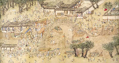 仇英的《清明上河圖》比宋本要長一倍,達到9.87米,以明代蘇州城為背景,采用青綠重設色方式,畫中人物超過2000位,描繪明代江南社會的城鄉人民生活實景,表現了熱鬧紛擾的市井生活和民俗風情,場面宏大,氣勢雄偉。唐末孫位的《高逸圖》(又名《竹林七賢圖》)中的畫名“孫位高逸圖”為宋徽宗趙佶所題,它所描繪的是魏晉時期膾炙人口的竹林七賢的故事。畫家通過嫻熟高超的技術,出色刻畫了魏晉士大夫的精神氣質。