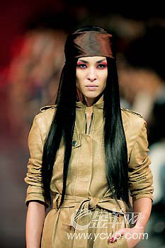 Dior2006-2007秋冬秀場的模特讓人印象深刻的,除了設(shè)計(jì)夸張的墨鏡外,人人都有一頭如旗幟般飄逸柔順的長直發(fā),統(tǒng)統(tǒng)包裹在紫褐色頭巾下,很有上世紀(jì)80年代的懷舊感。但更重要的是,每件衣服都暗含硬朗的符號,就像模特們脫掉墨鏡之后,露出詭異的紅色眼妝一樣,她們似乎都在堅(jiān)定地走不妥協(xié)路線。