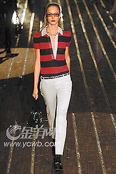 在Gucci今季以揚帆出海為主題的日間裝扮中,可以見到一條簡潔清爽的白色鉛筆褲貫穿始終,上身的海軍藍、白色及紅色條紋T恤,則用性感的低V設計來吸引人,腰帶細得若有若無,腳上是耀眼的金色高跟鱷魚皮鞋,既給人較中性化的感覺,又不失女性的韻味。要帥又要不失性感,實際上,這就是新帥男孩的最佳尺度。