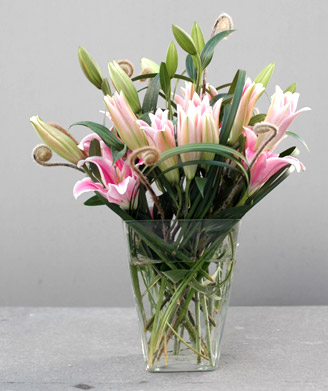 花材:粉色百合、春蘭葉、蕨芽