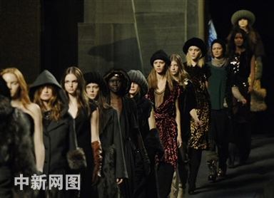 2006年2月6日,紐約時裝周,模特在展示Marc Jacobs設計的新款秋裝。華麗的細節使Marc Jacobs的作品總能奪目而不夸張。時尚的風向已經從對奢華永無止境的追求變成了現在的簡單低調。設計師不再大面積使用皮草,而是將其作為點綴,使時裝展現出低調的奢華。