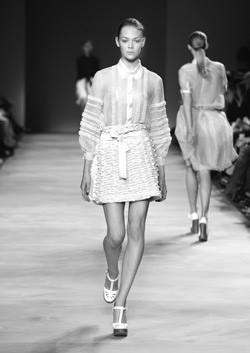 這一季的流行回歸到最單純的白色,但今夏的白色與往年大不相同。相比以往白色服飾給人的純潔印象,今年的白色系列挖掘的是白色性感的另一面:雪紡和蕾絲下面是十足的透明誘惑;鏤空、雕花、綴邊的“拼接”勾勒出女人的完美曲線;關注細節的刺繡、鑲嵌帶來的視覺感受,讓人回味無窮的精致性感……