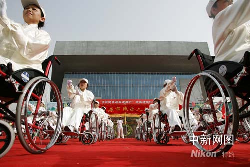 三十輛輪椅來到人群中,三十六位當地殘疾人帶來的一段太極拳表演給人們帶來別有情韻的意境:迎接奧運,挑戰自我,與奧運同行,生命在陽光下依然多姿多彩。由衷的喝彩聲已經在人群中響起來。