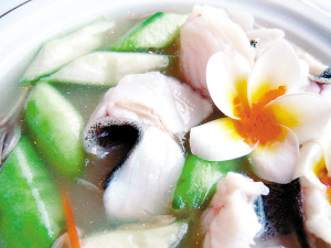 雞蛋花相信廣州人都不會陌生,我們通常拿它來煲湯,取其去濕氣、清熱毒、生津止渴的功效。這道“百花過橋魚”里面就有雞蛋花,此外還有菊花瓣,魚片是浸熟的。這個名字中的“百花”還有另一個含義,在廣州餐飲界行話里把花膠也叫做“百花餡”。