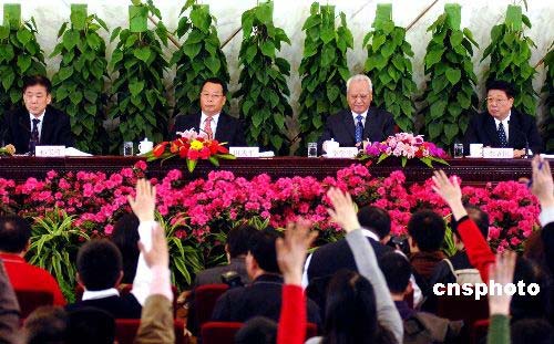 三月九日,十一屆全國人大一次會議在北京人民大會堂舉行記者招待會,由勞動和社會保障部部長田成平、副部長孫寶樹和民政部部長李學(xué)舉、常務(wù)副部長李立國,就勞動就業(yè)和社會保障問題答記者問。中新社發(fā) 王東明 攝