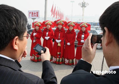 三月十日,十一屆全國(guó)人大一次會(huì)議在北京舉行第三次全體大會(huì),會(huì)議結(jié)束后,代表委員忙著抓拍美麗瞬間。中新社發(fā) 任海霞 攝