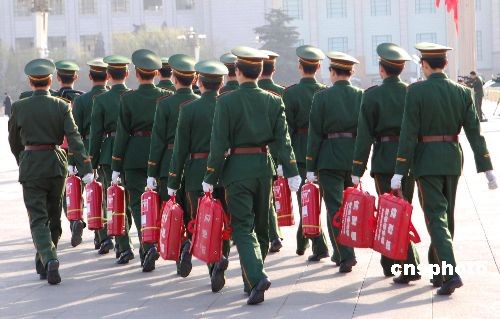 3月16日上午,武警官兵攜帶滅火器等消防設備列隊行走在北京天安門廣場上。中新社發 劉萬強 攝