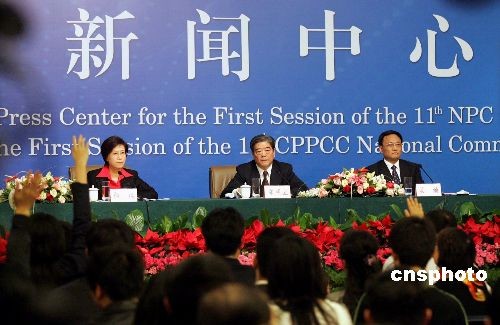 三月十六日,國家食品藥品監督管理局局長邵明立(中)等四名官員,在全國人大新聞中心,就食品、藥品安全問題接受中外記者集體采訪。國家食品藥品監督管理局在此次中國大部制改革中引人注目。中新社發 潘索菲 攝