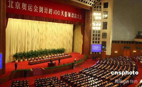 四月三十日,北京奧運會倒計時100天誓師大會在人民大會堂舉行。 中新社發 任海霞 攝