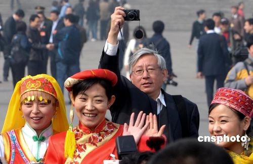 3月10日上午,十一屆全國人大一次會議在北京人民大會堂舉行第三次全體會議。香港鳳凰衛視著名主持人曹景行,在大會堂外抄后路偷襲抓拍靚麗的少數民族代表。中新社發 廖攀 攝