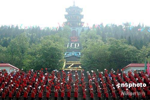 四月二十九日,一萬余名武術學校的學生在河南省登封市迎賓公園,以少林太極拳擂響大中原為主題,舉行迎接北京奧運會倒計時一百天慶典活動。 中新社發 李志全 攝