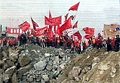 圖:截流成功現(xiàn)場工程人員在圍堰上揮舞紅旗慶賀