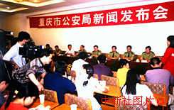 重慶警方神勇捕獲渝、湘、鄂持槍搶劫殺人集團頭號犯罪嫌疑人張君后,22日下午3時舉行新聞發布會,向渝、湘、鄂三省市及在渝中央新聞單位通報殺人魔頭張君駭人聽聞的殺人事實。作者:雷鳴