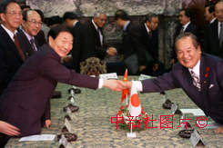 正在日本訪問的中國總理朱镕基總理十三日會見了日本參議院議長齋藤十朗。中新社記者:陶光雄