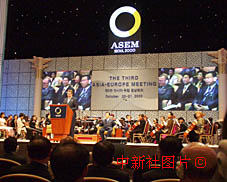 亞歐會(huì)議閉幕式,中國總理朱镕基的形象出現(xiàn)在主席臺(tái)的的屏幕上。中新社記者:王曉暉 攝