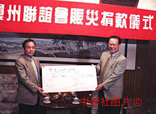 得知故鄉海南發生特大水災,“澳門瓊州聯誼會”會長歐國梁(左)一行八人,23日專程趕到海南捐款十萬元人民幣。這是海南發生災情后第一個向海南捐款的海外社團。海南省副省長韓致中(右)代表災區人民接受捐款。中新社記者 關向東 攝