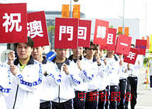 圖片:澳門電信局職工參加慶祝回歸一周年活動 2000年12月18日 15:44 ![]() 澳門電信局職工十六日手舉標(biāo)語牌,參加慶祝回歸一周年的系列活動。中新社傳真 宗金柱攝