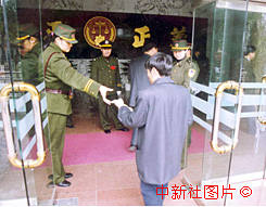 原江西省副省長(zhǎng)胡長(zhǎng)清一案十五日在南昌市公開(kāi)宣判,審判庭約千余旁聽(tīng)席坐無(wú)虛席。圖為南昌市中級(jí)人民法院的法警在第二道入場(chǎng)的關(guān)卡處驗(yàn)票。中新社記者 段八一 攝