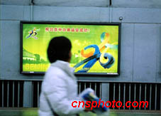 近日一千三百幅申奧公益廣告出現在北京地鐵列車沿線的站臺和車廂,為申奧助威。中新社傳真 羅偉攝