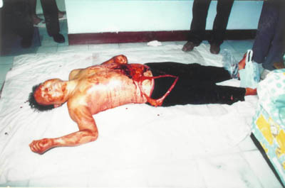 馬健民,男,54歲,華北油田退休職工。其家人稱,馬已練習“法輪功”兩年左右,達到了癡迷的程度,時常出現精神恍惚和失常,堅持認為自己的腹部有個“法輪”。1998年9月4日馬健民在家中用剪刀剖腹尋找,因救治不及時死亡。這是馬健民自殺后的慘景。新華社發