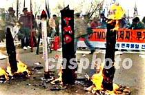四月七日,韓國市民、學生在首都漢城集會,抗議美國導彈防御系統和日本通過的美化侵略的歷史教科書。圖為示威群眾當眾焚燒了美、日兩國國旗和用紙糊制的導彈模型。中新社圖