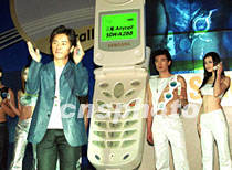 香港藝員鄭伊健9日在北京中國大飯店與模特兒同臺,為韓國三星新款雙屏幕移動電話走進中國市場作宣傳。中新社記者 王瑤 攝
