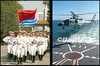左為海軍儀仗隊,右為艦載直升機攜帶反潛魚雷起飛攻擊演練