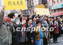 紐約華人社團聯合會等僑團二十一日在華埠鬧市的六個地段向行人講解“法輪功”的危害。聯合總會主席梁冠軍(左四)用麥克風向“法輪功”信徒呼吁珍惜自己和家人的生命,不要再受李宏志的蒙騙。中新社圖 郭健 攝