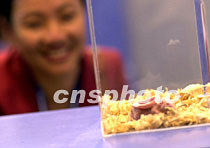 一只小裸鼠身背人造組織耳,十日在北京國際科技博覽會上成為觀眾的寵物。這是中國高科技功關項目組織工程的成果之一。中新社記者 賈國榮 攝