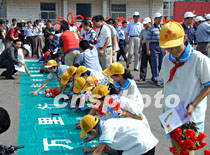 “申奧萬里行”4日到達山西省陽泉市,一群小學生踴躍地在申奧萬里行布條上簽名支持北京申奧。中新社記者 呂振亞 攝