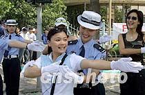 參加“申奧萬里行”的莫慧蘭向女交警學指揮交通 中新社圖 魏孝明 攝