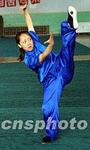 第三屆世界武術錦標賽劍術冠軍周淑紅為“萬里行”車隊表演一套八卦拳,以表達自己對北京舉辦奧運會的的熱切期盼。中新社圖 魏孝明 攝