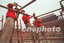 建筑工人連日在北京紫禁城午門前廣場搭臺,為六月二十三日世界三大歌王的演唱會抓緊施工。中新社記者 史利 攝