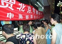 ![]() 七月十四日香港市民爭相購買為慶祝北京申辦2008年奧運會成功,香港郵政、中國郵政及澳門郵政七月十四日聯合發行的紀念套摺等郵品。中新社傳真 任海霞 攝