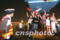 ![]() 十四凌晨,北京市大批慶祝申奧成功的的年輕人站在長安街公安交通崗亭上,交通警察在一旁輕松觀望。中新社 劉殊瑾 攝