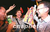 組圖:北京市民在天安門慶祝申奧成功 2001年07月14日 18:37 ![]() 7月13日午夜,北京申奧成功的消息傳來(lái),天安門廣場(chǎng)上的人們敲鑼打鼓來(lái)慶祝。中新社圖 劉殊瑾 攝 ![]() 外國(guó)友人和北京市民7月14日凌晨歡聚天安門廣場(chǎng),慶祝北京申奧成功,他們說(shuō):“現(xiàn)在屬于中國(guó)。”