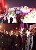 組圖:北京申奧代表團(tuán)7月14日晚載譽(yù)歸來(lái) 2001年07月15日 18:34 ![]() 中共中央政治局常委、中國(guó)國(guó)家副主席、中央軍委副主席胡錦濤(右一),十四日晚在北京首都機(jī)場(chǎng)熱烈歡迎北京申辦奧運(yùn)會(huì)代表團(tuán)從莫斯科載譽(yù)歸來(lái)。 ![]() 中國(guó)國(guó)家副主席胡錦濤十四日晚在北京首都機(jī)場(chǎng)迎接國(guó)務(wù)院副總理李嵐清率領(lǐng)的北京奧運(yùn)會(huì)申辦代表團(tuán)回到北京。