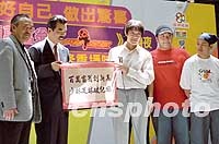 亞視行政總裁封小平(右二)與周星馳等人出席儀式,周星馳將聯同《少林足球》演員于20日踏上「百萬大道」,爭取百萬善款,該晚贏得之所有獎金,將全數撥捐瑪麗醫院癌病兒童。中新社圖 吳智仁 攝