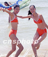 在美麗的青島海邊,兩名參加一場模特大賽的靚女身穿泳裝,舞動著絲巾在海浪中盡情起舞。中新社記者 錢興強 攝