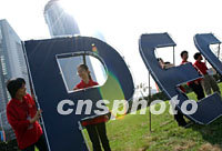 上海理工大學的學生身穿紅色志愿者服裝,在東方明珠塔前為上海APEC會議服務。中新社記者 王瑤 攝