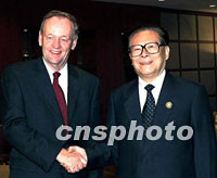10月20日,中國國家主席江澤民在上海會見加拿大總理讓·克雷蒂安。中新社圖