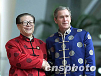 10月21日,中國國家主席江澤民在上海科技館迎接美國總統布什。亞太經合組織第九次領導人非正式會議在這里舉行。中新社圖