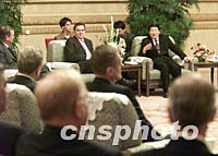 ![]() 國(guó)務(wù)院總理朱镕基與德國(guó)總理施羅德三十一日在北京共同會(huì)見(jiàn)隨同施羅德訪華的德國(guó)企業(yè)家。中新社記者 滿會(huì)喬 攝 ![]() 國(guó)務(wù)院總理朱镕基與德國(guó)總理施羅德三十一日在北京共同會(huì)見(jiàn)記者并回答記者提問(wèn)。中新社記者 滿會(huì)喬 攝