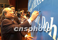 中新社記者卡塔爾特寫:今宵多歡樂(附圖) 2001年11月12日 02:42 ![]() 中國加入WTO簽字儀式于北京時間12日凌晨在多哈舉行,圖為簽字現場。中新社記者 錢興強 攝 ![]() 石廣生部長于北京時間12日在多哈簽署中國入世議定書后,在會場橫幅上簽名留念,記錄下這一歷史時刻。中新社記者 錢興強 攝