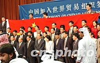 圖:中國代表團成員在國旗前留念 2001年11月12日 02:46 ![]() 北京時間12日中國代表團成員在多哈展示中國國旗,慶祝中國入世。中新社記者 錢興強 攝 |